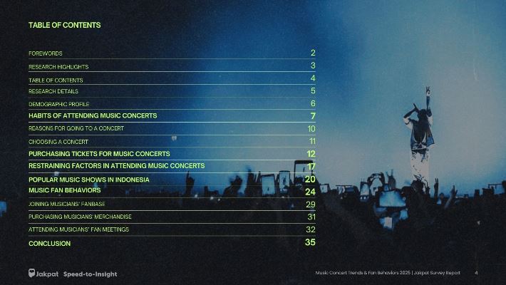 Jakpat merilis laporan tahunan Music Concert Trends & Fan Behaviors 2025 yang melibatkan 1.658 responden pada 15–17 Agustus 2025. Laporan ini memotret preferensi genre, alasan menonton konser, hingga perilaku penggemar dalam mendukung idola mereka.