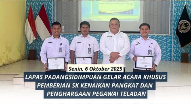 Padangsidimpuan,Sidaknews.com – Lembaga Pemasyarakatan (Lapas) Kelas IIB Padangsidimpuan menggelar acara khusus penyerahan Surat Keputusan (SK) kenaikan pangkat serta piagam penghargaan bagi pegawai teladan periode September dan Oktober 2025. Kegiatan berlangsung di Aula Utama Lapas Padangsidimpuan pada Senin (6/10/2025).