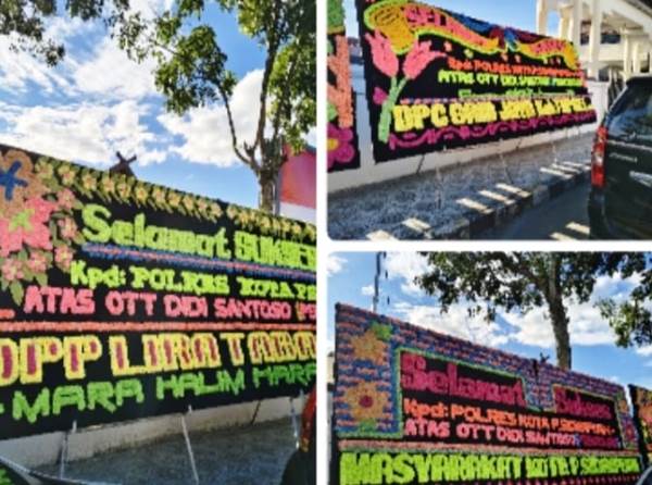 Salah satu papan bunga bertuliskan “Selamat dan Sukses kepada Polres Padangsidimpuan atas OTT terhadap Didi Santoso (DS)”, yang dikirim oleh DPC GRIB Jaya Kabupaten Tapanuli Selatan.