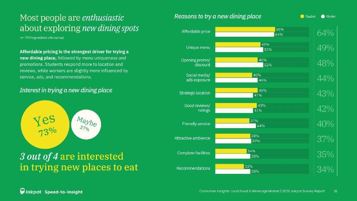Mencoba tempat makan baru kini menjadi bagian dari gaya hidup banyak orang, terutama dengan beragam pilihan kuliner yang terus bermunculan. Mayoritas konsumen tertarik mencoba tempat makan baru karena faktor harga yang terjangkau, dengan 64% menyebut kesesuaian budget sebagai pertimbangan utama.