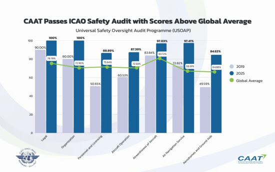 Bangkok, Thailand – Otoritas Penerbangan Sipil Thailand (CAAT) mengumumkan hasil audit sistem pengawasan keselamatan penerbangan sipil di bawah Universal Safety Oversight Audit Programme – Continuous Monitoring Approach (USOAP CMA) oleh Organisasi Penerbangan Sipil Internasional (ICAO). Audit tersebut berlangsung pada 27 Agustus hingga 8 September 2025.