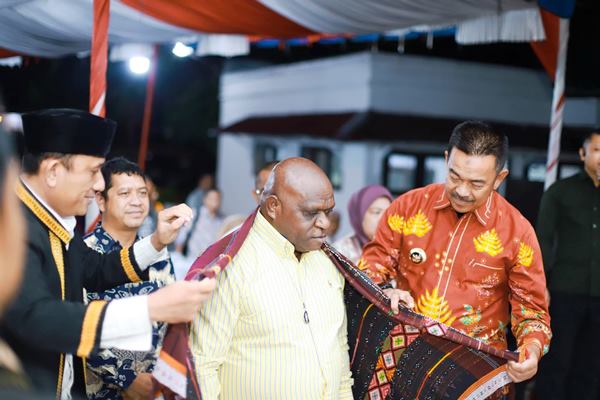 Bupati Mandailing Natal H. Saipullah Nasution menyambut kedatangan Menteri Hak Asasi Manusia (HAM) Natalius Pigai, dengan prosesi adat pemberian Ulos di Pendopo Rumah Dinas Bupati Madina, Desa Parbangunan, Panyabungan, Sabtu malam (18/10/2025).